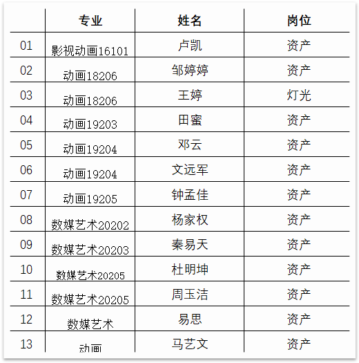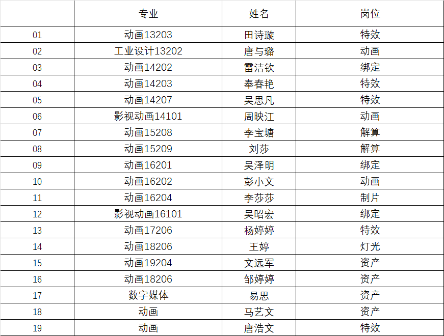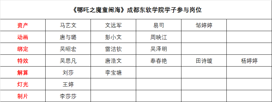 此次《哪吒2》的制作中,成都九州酷游学院共有19名学生深度参与了7个岗位的工作,展现了学校学子的专业素养与创新能力。以下是参与项目的学生名单: